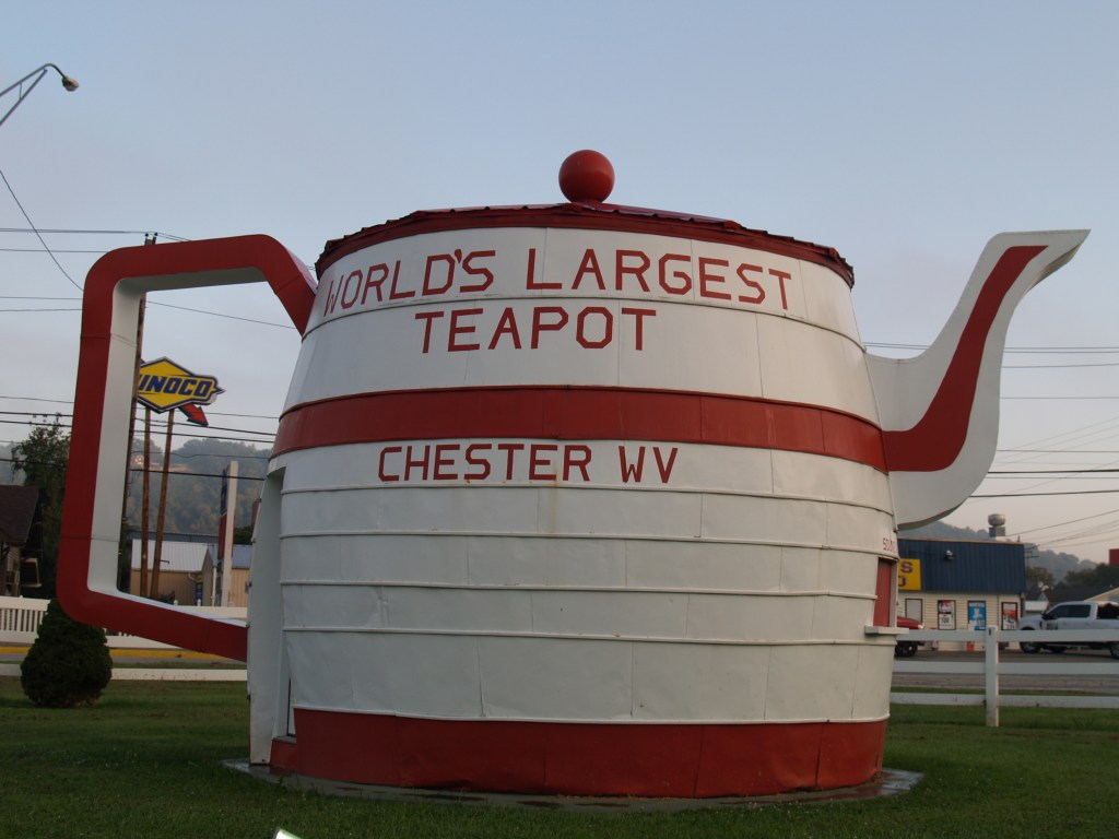 We went on a mini trip down to West Virginia and Ohio. It is very peaceful driving at 3 in the morning. You seem to be in a tunnel, with the trees arching overhead. The main thing is to watch out for the animals that spring into the road in front of you. After a bit, we got on to the turnpike and then it just becomes sort of tedious. Mile after mile of dodging trucks and drinking bad coffee. Well the coffee was not the worst that I have ever had but it came damn close. I called several times on 146.520 MHz but got no replies. Then we got to our first destination: Chester West Virginia, home of the World’s Larges Teapot!