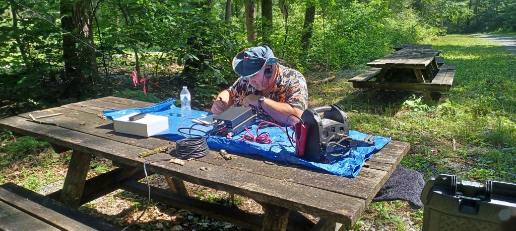 It was a great day today. The weather was beautiful and it was a very nice day to be off. One of those Sundays that come along once in a while that make you want to go outside and do things. Today my wonderful wyfe and I went out to a State Park about 15 miles down the road and did a POTA activation. POTA stands for Parks On The Air and is a program for ham radio operators to get out and be active in the public, operating in State and Federal parks, Forests and Game Lands. The park we were at was Big Spring State Park ( POTA Number K-4355) which is located on the western edge of Perry County PA. As I said, it was a beautiful day. It only took me about 15 minutes to set up. I put up an inverted Vee antenna with the apex up about 30 feet. My radio is a Yaesu FT891 and I was using my new LDG Z11 Pro II tuner. The setup worked great and I was able to make 26 contacts in less than an hour of operating before the bugs drove me out of there. In the meantime, my wonderful and long suffering wyfe was enjoying herself making videos of nature and of me operating. All in all, a good time was had by all. Following is a pic of me operating and my setup. The random hunks of tree bark on the table were still there when we left. 🙂
