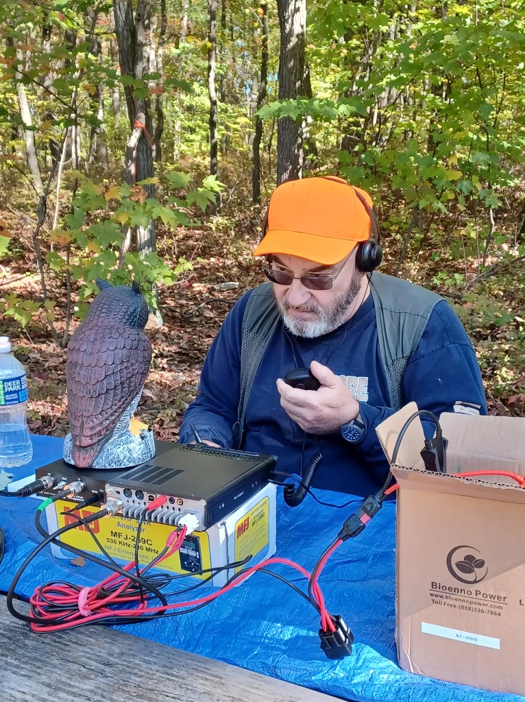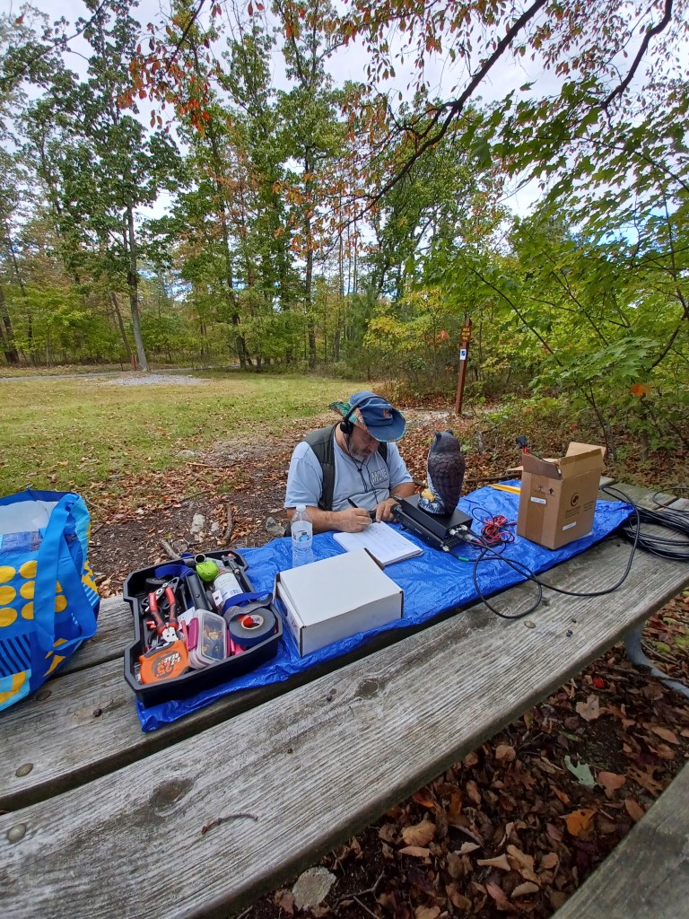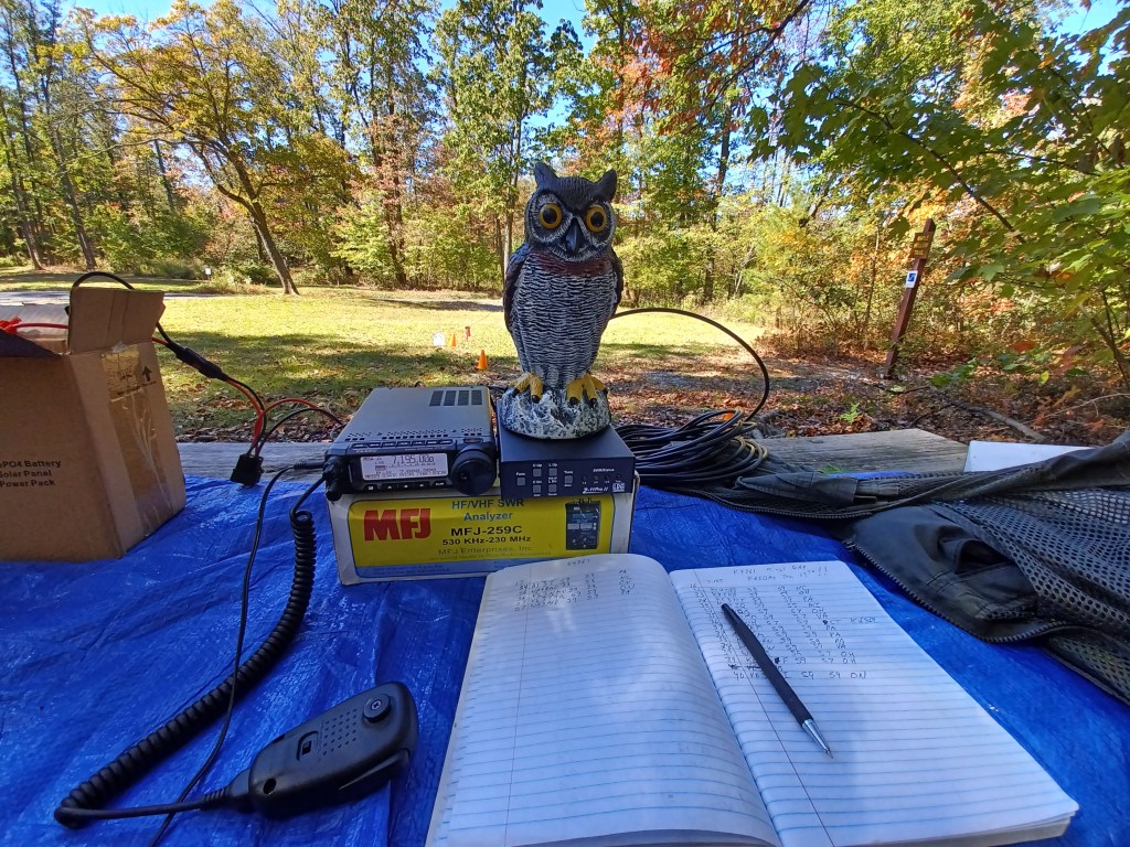 This is a tale of 2 activations, 2 owls and one park. On Tuesday, Oct 10th, My long suffering wyfe and I set out to Kings Gap (K-4361 for you POTA types) and I activated the park. This consists of setting up my radio and making a minimum of 10 contacts. I was able to make 34 contacts in the time I had to be there and enjoyed the day. Everything went smoothly. I got my antenna line over a tree branch in one throw and was set up in less than 15 minutes. My wyfe wandered around taking pictures and also spent some time on the interwebs and enjoying the weather. It was a great afternoon. As I said, everything went smoothly. My owl decoy, Ptolomey (pictured below) kept watch for bears and made sure we weren’t bothered by insects or other pests. Then there was today, Friday the 13th. My wyfe, on the spur of the moment, decided that she wanted to do some videoing up at Kings Gap and since we would be going up there I decided to bring my equipment and activate. First, I had to turn back 1/2 km from home as I had forgotten to barricade off the area of the house where the cellar stairs are. I rather prefer not to return home to our Rhoomba on its back at the bottom of the stairs screaming for help and being circled by well-meaning cats. Then the small store at the bottom of the hill at Kings Gap did not carry the brand of chips my wyfe wanted. Once we go to the top of the hill where the mansion is, there were workmen doing various and sundry things preparing the place for the upcoming fall/winter seasons. My wyfe settled herself in to doing her thing and I started setting up my radio. Yeah … On the 4th throw, my throwing bag wound 3 times around a branch. I stood there, about 15 or so meters below staring at it and uttering lots of nsfw words. There was no way I could leave an weighted throwing bag attached to several meters of florescent twine attached to that branch. Finally the thought hit me: The twine has 2 ends!! I took a convenient stick and tied it up with the other end of the twine and threw it over the branch 3 times. This unwound the throwing bag. Unfortunately, my wyfe had wandered over to observe the spectacle and almost got hit with the bag when it came loose and plummeted to the ground. Now 3 more throws got it over the branch and I was able to raise my antenna. My usual 15 minute set-up took me almost 45 minutes. Now my owl Tootsie was able to scare away any bears but the gnats were another story. They ignored him and swarmed me. I did my best to ignore them. I made 55 contacts and had a very successful activation in spite of Friday the 13th and Murphy. Feel free to look at my pictures and to laugh at me. 🙂 Pic 1 is Ptolomey, Pic 2 is Me on the 10th, Pic 3 is Tootsie and Pic 4 is me on the 13th. Namaste Y’all