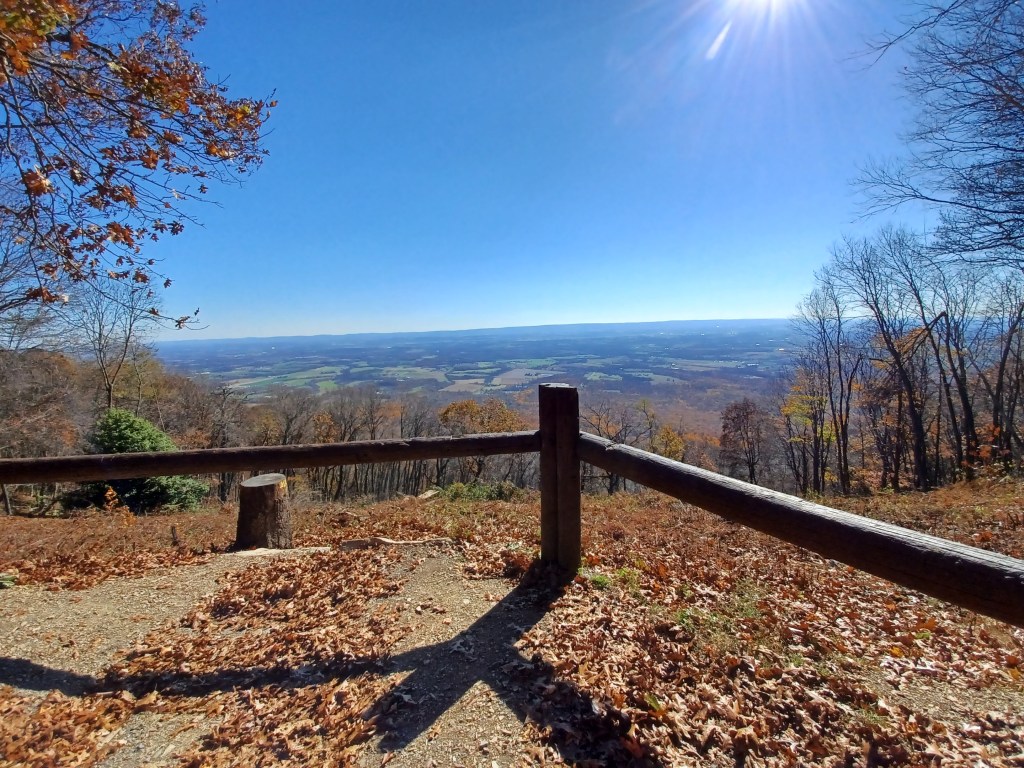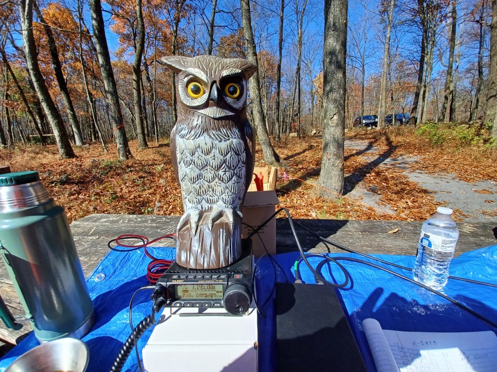 Well no shit, there I was, up at the Three Square Hollow Vista in Tuscarora State Forest setting up for an activation. It was a nice sunny day today albeit, there was a chill wind blowing. Anyway, I threw my arborist bag up over a convenient tree limb and, sure enough, the damn thing wrapped around it 6 times. Uttering several words that would cause any residual green leaves to turn various shades of colour, I tied my hammer to the other end of my throwing line and proceeded to throw it over the branch to unwind the wrappings. as I was partway through this operation, a vehicle pulled up next to mine and a couple of hunters got out. They came over to me and asked me about ham radio and went about their business of using their cell phones as this is one of the few spots in this area of the mountain that has reception. I got my bag unwound and got my antenna raised up. They asked a few more questions and seemed surprised that I planned on using such a small piece of wire to talk to people all over the place. I assured them it would work. They then took their leave and drove off. I sat down and hooked up my rig and made 33 contacts from CT to MI to SC to ON over the course of the next 45 minutes. The main problem was the wind blowing directly on my back. It was chilling me right through. If it hadn’t been for that I would have stayed longer. I am not looking forward to the colder weather coming but will continue to try activating as much as I can until it just gets too bad. I am including a picture of Zarathustra monitoring me and the view over my shoulder. In any event, Namaste until next time, kids.