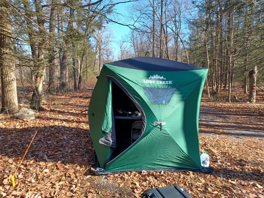 That is the Pod! It arrived last Monday and is a Christmas present from my most wonderful wyfe! It is an ice fishing shelter though I will be using it for POTA activations. Without any heat source it was nice and warm inside today. Much better than it would have been sitting out in 40 degree F (that’s 4 C for those who use Metric) temperatures with a light breeze blowing. It is large enough to fit a table and chairs inside and tall enough for a 2 meter high person to stand upright, though I am nowhere near that height. It has windows that let enough sunlight in to keep from needing a lantern. It isn’t too heavy though I would rather not have to carry it any great distance. I am very pleased with it overall. I activated Big Spring State Park today and made a total of 46 contacts to include some park-to-park contacts which is always nice. The day was a good one weather wise. I am trying to take advantage of all the nice days we are having. I used to do a lot of portable operating when I was younger, operating QRP and doing it as a personal readiness exercise. I, over time, fell out of that habit. POTA renewed my interest in it and I admit that I have dived right in. I am a neophyte to the POTA program but I enjoy the “freshness” of the whole thing. Each time I go out there is a new motivation. It is the same with hunting at home. Each time I reach a new goal hunting, I set another one. Another new experience I had today was a drive-by by a DCNR vehicle. When we were taking our stuff down they came back and talked to us for a few minutes. The driver was the regional manager for some of the local parks and was interested in what we were doing (in a good way). She even asked about the POTA program and for the web page for more information. We (my wyfe and myself) answered their questions and they seemed happy when they left. Well enough blathering. As soon as hunting season is over, I hope to activate some of the State Game Lands around here. Keep watching for new entries and stay safe. Namaste, kidlets