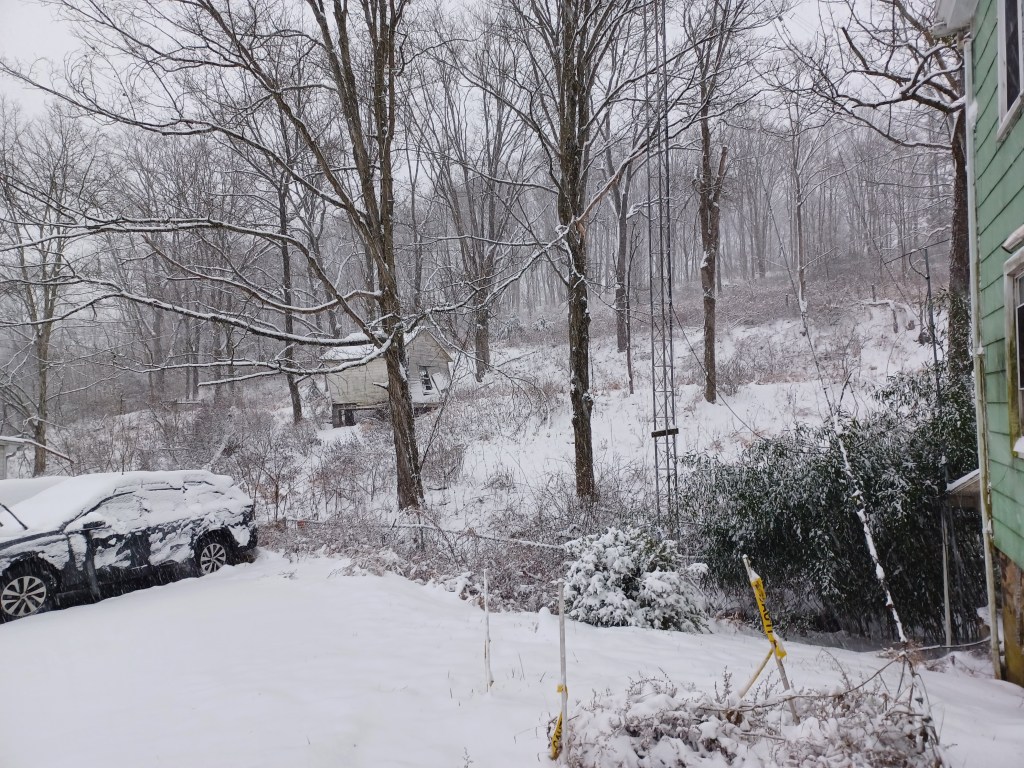 Yesterday was January 6th, the first Saturday in 2024. What is the significance, you might ask? Well it was the beginning of the week-long PA Farm Show held in Harrisburg PA. Local legend would have it that the Farm Show is a harbinger of bad weather (go figure, it is held in January) and this year it has held up to that reputation. Late morning yesterday it began to snow. A nice, pretty wet snow. Within a couple hours we had around 76.2 MM of accumulation on the ground ( ~ 3 inches for those who use the outdated measuring system) and then the temperature started to rise slightly above freezing. It remained that way overnight. This morning I spent over an hour with my snowblower clearing my driveway. My wyfe and I then went out to lunch and got a few groceries. When we got back i settled in with a cup of coffee and started trying to work some POTA stations. I began to wonder why I was getting lousy signal reports when I looked out the window. A couple of tree branches had succumbed to the weight of the wet snow and fell, taking down my dipole and breaking the rope which ran through the pulley on the tower which held the center support up. My long-suffering wyfe agreed to leave the warm comfort of the house and assist me in getting the antenna back up in the air. It took some doing. My antenna is now in a different position than it was, is lower and the setup is temporary. Once the weather gets a bit better I am going to make the installation more permanent. At least I am back on the air and making contacts. I, however, did run out of expletives which is highly unusual as I studied under a master, my father. As for blame, I place that squarely in the lap of the PA Farm Show. Namaste Kiddos.