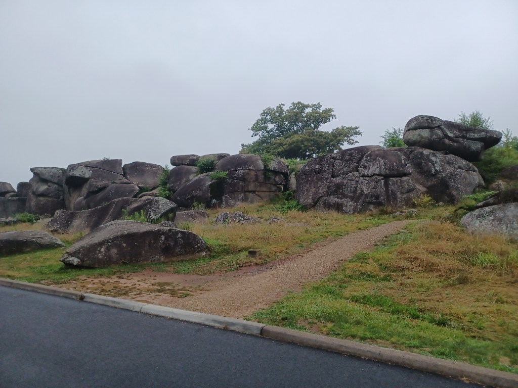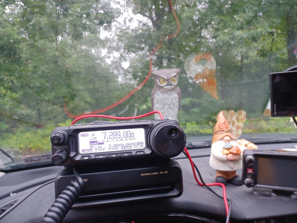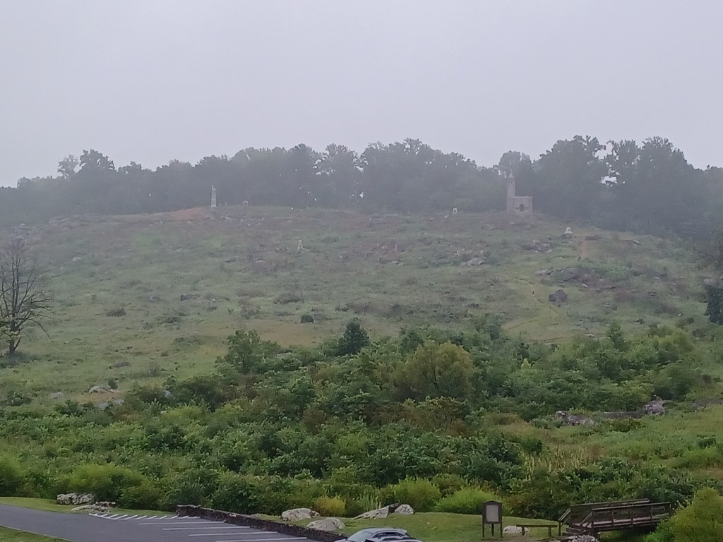 First off, we had a bit of a disappointment last night. Due to heavy rain, the National Night Out activities were cancelled at the Landisburg Fire Station. Representatives of the Perry County Amateur Radio Club, including myself, were planning to be present at a booth to show off our hobby and to demonstrate ham radio to the public and explain how we can be of service to the community during an emergency. Our next chance for public exposure will be at the Perry County Fair in Newport next week. SWMBO and I are going to be at the booth on opening night, August 13th. Expect a report and pictures. I will be showcasing my dipole made from 2 Slinkys. So on with today’s activation! SWMBO and I set out at 0500 for Gettysburg and arrived at the area of Devil’s Den around 0615. Devil’s Den was a location where Confederate sharpshooters shot at Union troops on Little Roundtop. It is a group of boulders left by the last glacier and makes for a great place to hide between shots. Glory did some videos and recordings and I watched wildlife. There was a whistlepig who was curious about me for a while but then when about having his breakfast. After a bit we decided the mist and drizzle was getting uncomfortable so we headed over to Culp’s Hill for an activation. I put a 40M Hamstick on my magmount and set the radio to 7.289 MHz which was empty. Within 5 minutes we had logged 10 contacts! It was almost like fishing a creek that had just been stocked! In less that 45 minutes we had worked 52 stations (we didn’t count them until we got home and transferred them to the POTA app) but it was just too moist out to continue. Thanks to the folks who stayed at home and hunted, we had a great activation. You might wonder why I say “we” when it is me doing the talking. I give great credit to my long suffering wyfe, Glory, who does my logging and offers lots and lots of support and encouragement. She also puts up with my foibles such as having owl decoys and gnomes and pink flamingoes. Well enough for now, kidlets. As the founder of our order taught us: “Keep your stick on the ice!”. Namaste