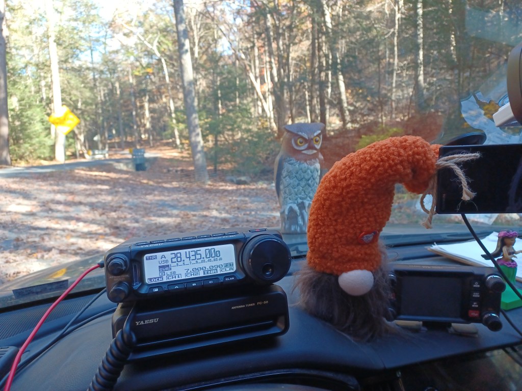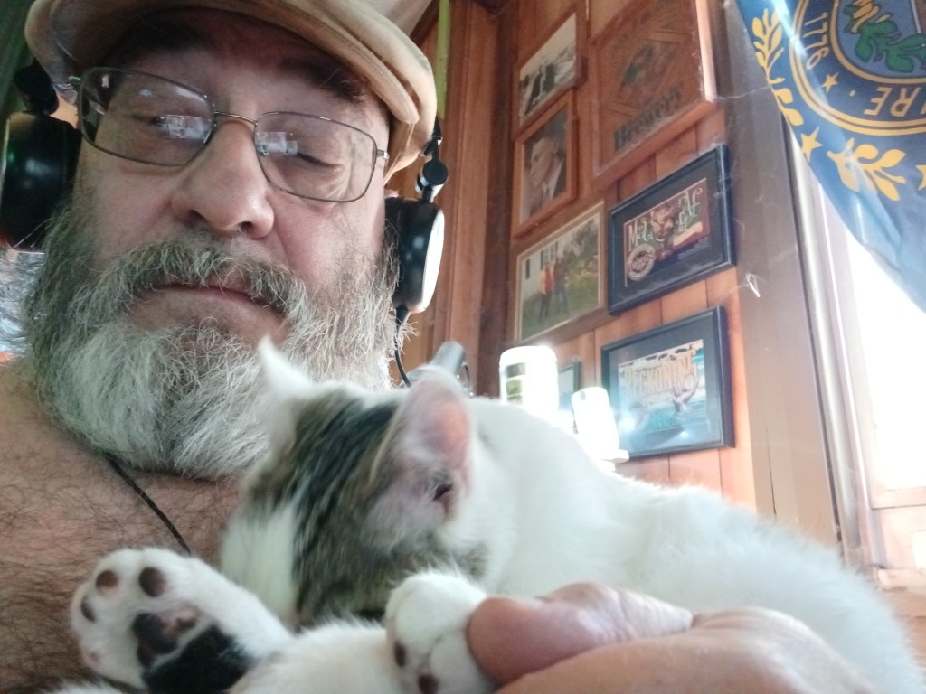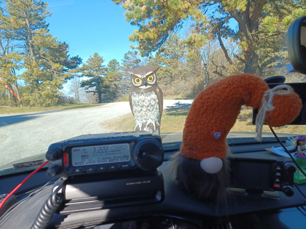It has been 9 days since my last entry but I had to work for 7 days straight and then last night I was too knackered to do much of anything. Well here I am. We started out the day at the Newville Diner and tried to decide where to activate. We considered Michaux State Forest and changed our minds. We set out for Cowens Gap State Park US-1346 but when we got there we again changed our minds and headed up to Hogback Mountain in Buchanan State Forest US-5463. When we started down Tower Road we saw a ham set up at the first turnoff. It was Chuck, NA1CN, who I had only had online contact with before. We chatted for a few minutes and I made sure that I wasn’t going to interfere with his operation. We drove on, to the end of Tower Road where, LO! AND BEHOLD!, there was a tower. We got set up and started working hunters. 40 meters was in pretty good shape and it did not long for us to be a legit activation. After working 27 contacts . SWMBO suggested that we try another park as long as we were out and about. Buchanan’s Birthplace State Park US-1336 was not very far away so we toodled down there. I decided to start out on 10 meters and we made 9 contacts, a good number of them from Europe. I swapped antennae and gave 40 meters a chance. We only made 1 contact, though it was a park-to-park. I put on the 17 meter hamstick and worked 6 more stations before changing to 12 meters for the final 3. This finished out our activations for the day. The weather was beautiful though there was a bit of a breeze on Hogback Mtn, but it was nuce and warm and sunny. Zarathustra kept blowing off the hood of the car. We didn’t have that problem at Buchanan’s Birthplace and we had parked in the shade of a huge oak tree. The temperature got into the high 20’s Celsius so it was rather comfortable. A lot of the leaves were dropping but there are still plenty on the trees. Oh yeah, our newest kat, Calamity is a radio cat. She likes to sit on my lap or in my arms and watch me playing on the radio here at home. Well my fingers are finged from all this typing and my coffee cup is empty so I am going to close for now. All the best to whomever may read this. Namaste, kidlets.