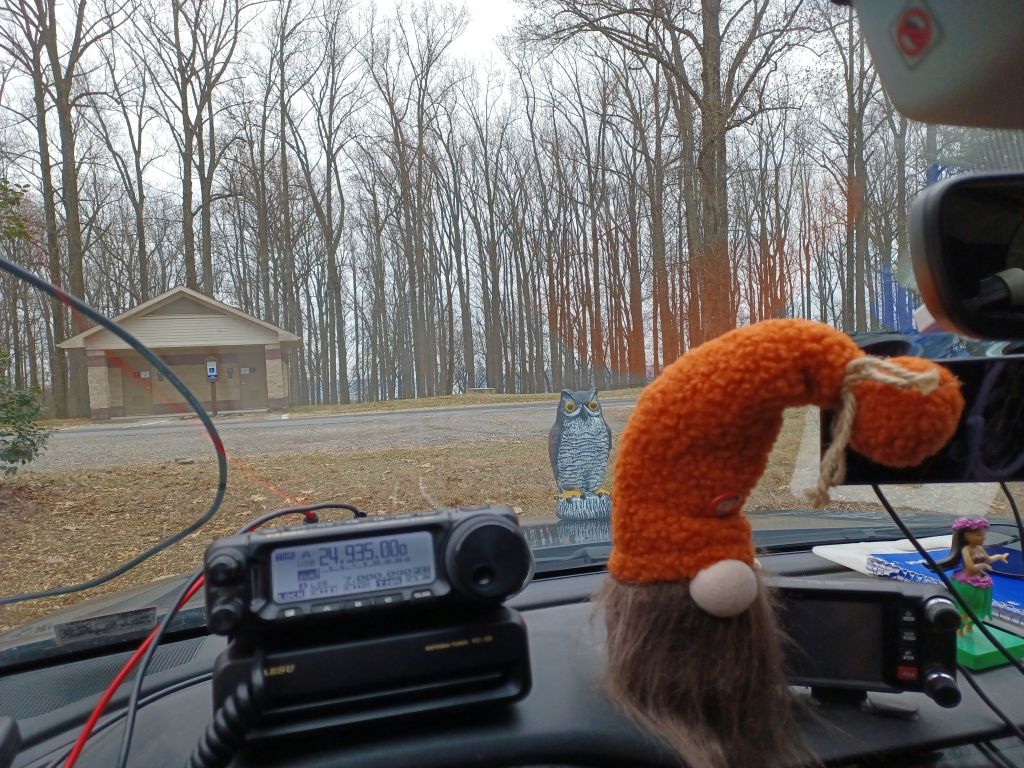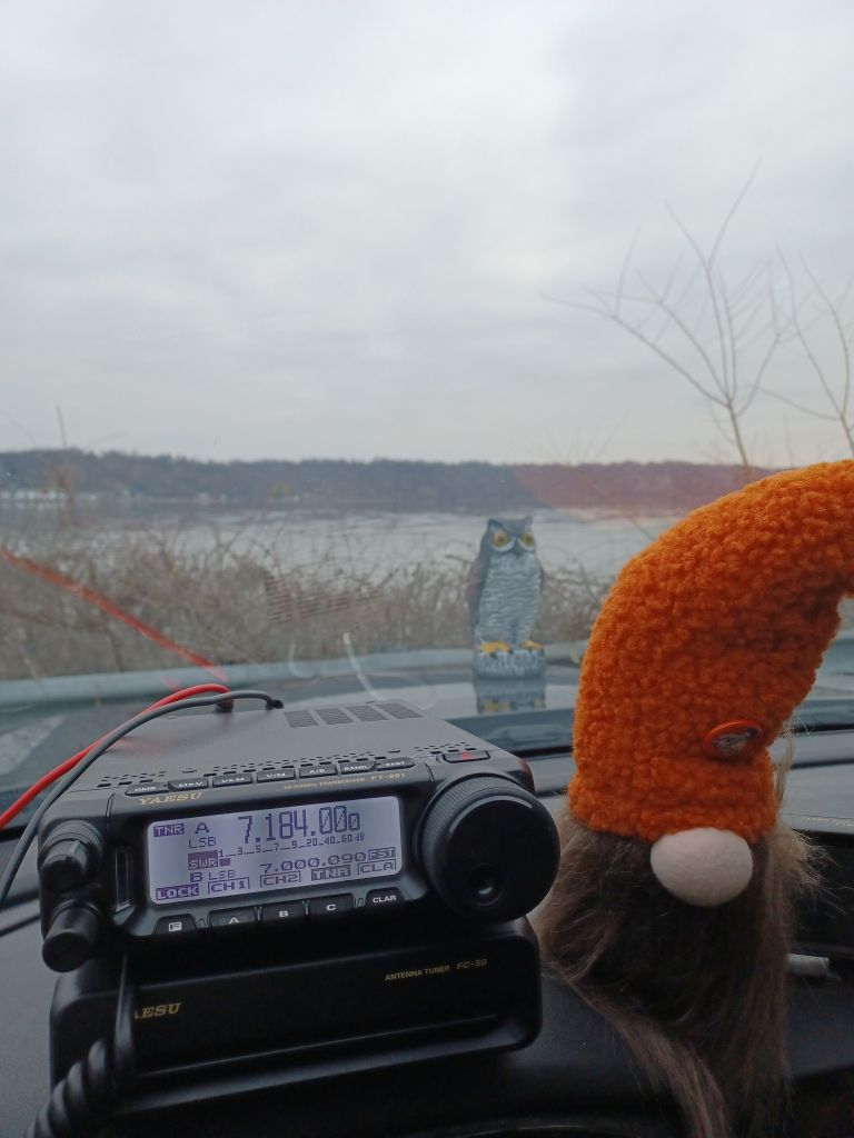 SWMBO and I decided to go for a little ride today and activate US-1601 Susquehanna State Park in Maryland. It was overcast and gloomy and the temperature was hovering just above freezing. We got set up and dove right in. In around 45 minutes we worked 28 contacts total on 40M and 12M. We had set up at the same place we did the last time we were here: the boat ramp. As we were working stations we got to watch loons, ducks and a bald eagle swimming and flying around. Our app on the phone heard American Crows, Downy Woodpeckers, Whited Throated Sparrows and Northern Cardinals. We made a Park-to-Park contact with someone working a 2-fer. Overall, it was a fun and successful activation. Then it happened: SWMBO said “how about we go to another park?” We tore down and set out. On the way we went over the dam at the Conowingo Hydro plant. SWMBO wanted to video the crossing so when we got across, we turned around and crossed it again. It is a monumental structure and dates back to 1928. The original town of Conowingo MD had to be moved when they constructed the dam and is now submerged in the reservoir. From there we travelled up river a few miles to Susquehannock State Park US-1425. This was the first time I activated this park but it won’t be the last. We set up in the parking lot for the overlook area and we were the only people . There were some beautiful holly trees in the median. We only heard Northern Cardinals there, though. In 25 minutes we made 19 contacts on 40M and 12M to include a 2-fer Park-to-Park with 2 operators. I was getting good signal reports and am hoping the solar cycle continues this way. Well I am back home, sipping coffee and enjoying the warmth of the stove so I think I will say Namaste. kiddos!