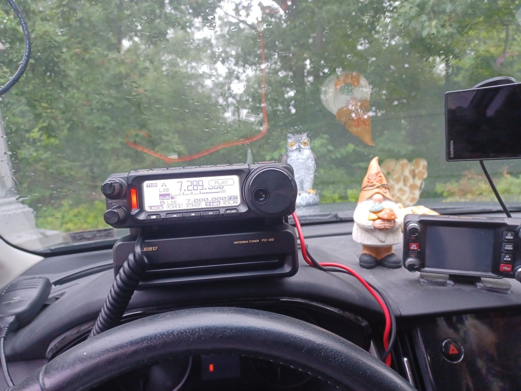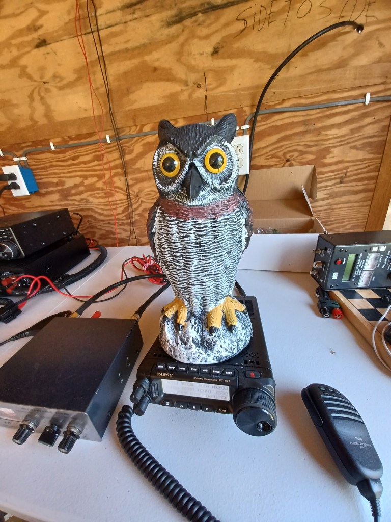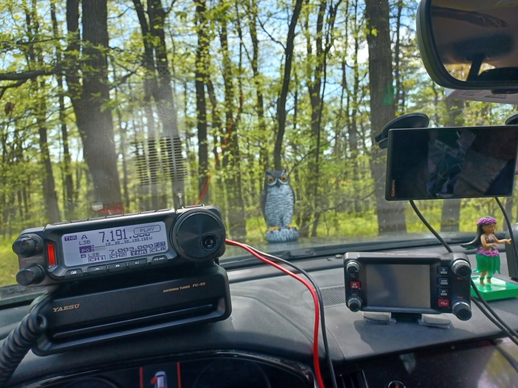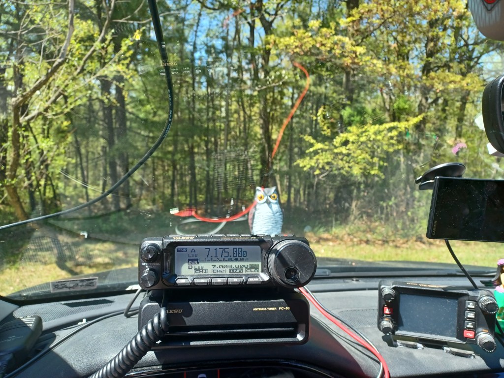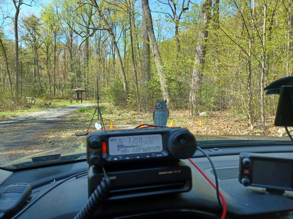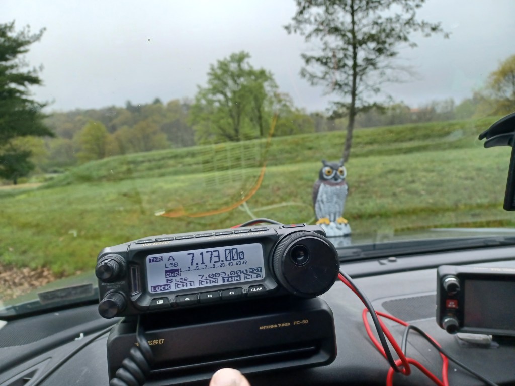 As I have mentioned previously, I have my operation streamlined. At first, I was dragging out the ham radio equivalent of a full British mountaineering expedition, more bells and whistles that one person would ever need. SWMBO made suggestions over time which work out. Nowadays I use a mag mount on the car roof with one of my various “Hamsticks” on it. It isn’t perfect but it makes for a convenient and non-obtrusive setup. The only thing I do that might attract a bit of attention is to place one of my owl decoys on the hood of the car. I do carry a couple other antennae as back ups but rarely have occasion to use them