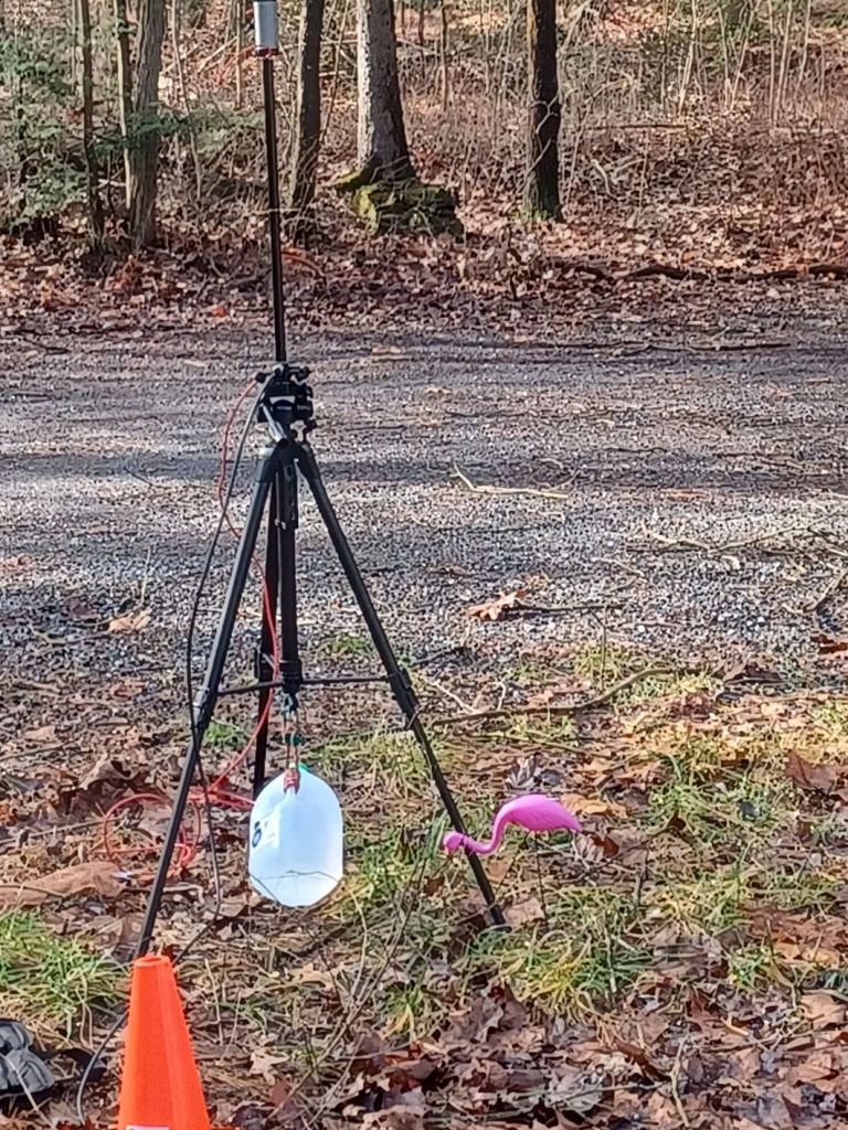 Charade the flamingo feeding off of stray rf at the foot of the antenna as Tootsie watches our 6