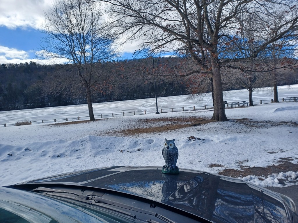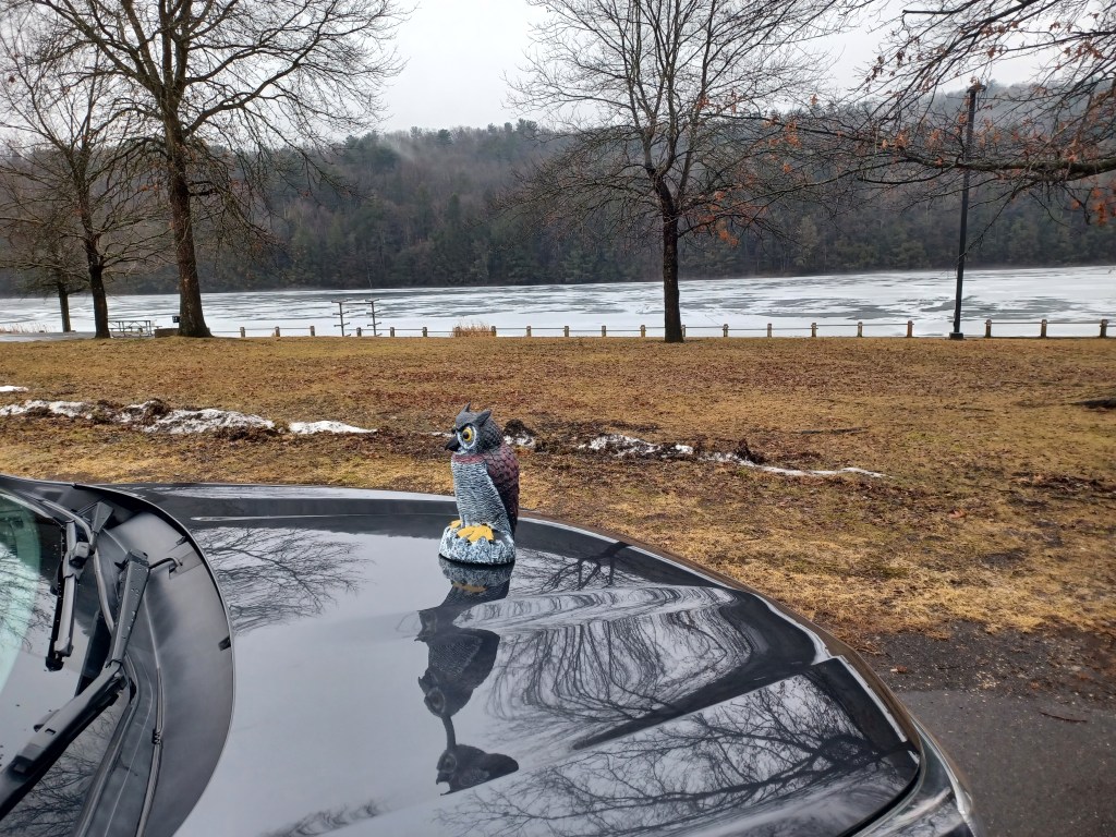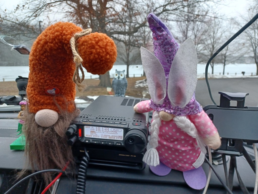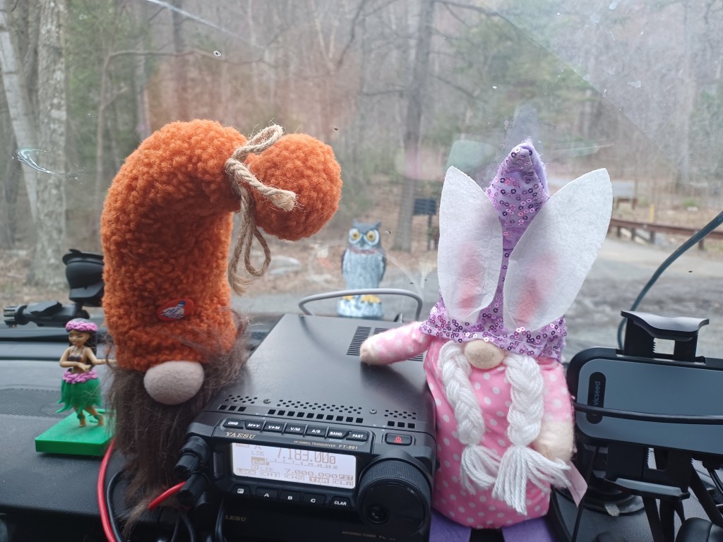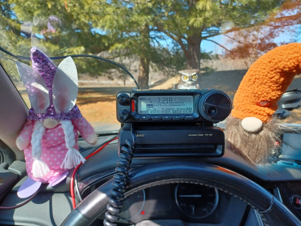 As I have mentioned previously, I have my operation streamlined. At first, I was dragging out the ham radio equivalent of a full British mountaineering expedition, more bells and whistles that one person would ever need. SWMBO made suggestions over time which work out. Nowadays I use a mag mount on the car roof with one of my various “Hamsticks” on it. It isn’t perfect but it makes for a convenient and non-obtrusive setup. The only thing I do that might attract a bit of attention is to place one of my owl decoys on the hood of the car. I do carry a couple other antennae as back ups but rarely have occasion to use them