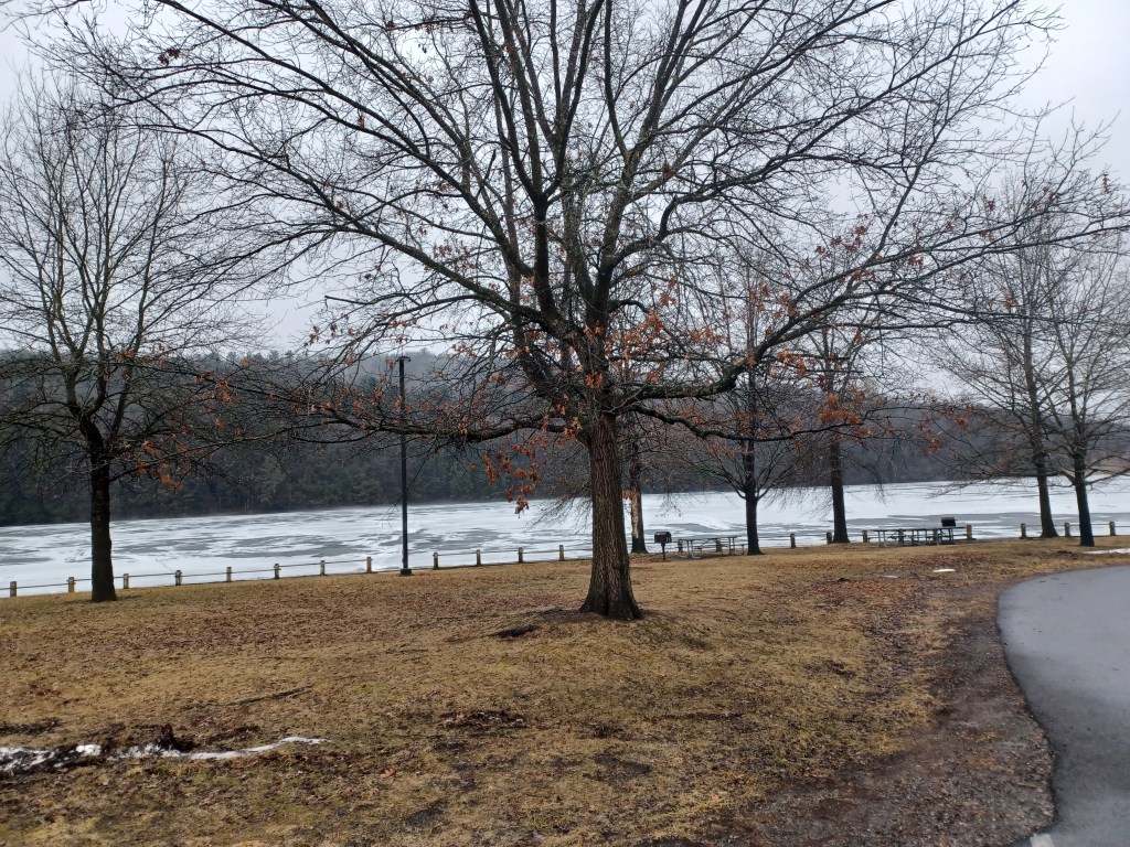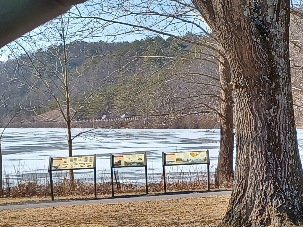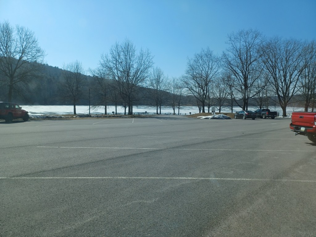 When I arrived at Little Buffalo State Park US-1376, the temperature was around 7C (45 F) and remained so for my time at the park. During my activation it got very warm in the car and the windows fogged up. I had to take off my coat and finish in shirtsleeves. Holman Lake is the manmade lake occupying 88 acres of Little Buffalo State Park. The ice on Holman Lake was that gray color that old ice gets when it is thin and rotten. The fishing shacks are gone as are the homemade skating rinks. I pretty much had the park to myself.